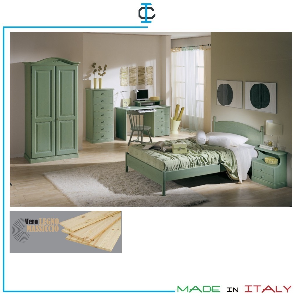 Camera per Single in legno tinta Verde. Letto, comodino, comò, ante armadio, realizzate in legno Pino massello sp. 25 mm.,in finitura tinta Verde. Camera composta da : 1 letto , 1 comodino, 1 armadio 2 ante, 1 settimanale, 1 scrivania porta PC, 1 sedia. Attrezzatura : 1 tubo appendiabito per ogni vano. Stile Rustico. Misure (cm): Armadio L.107 P.62 H.210 Letto L.128 P.202 H.88 Comodino L.51 P.30 H.55 Settimanale L.62 P.46 H.132 Scrittoio L.140 P.61 H.75