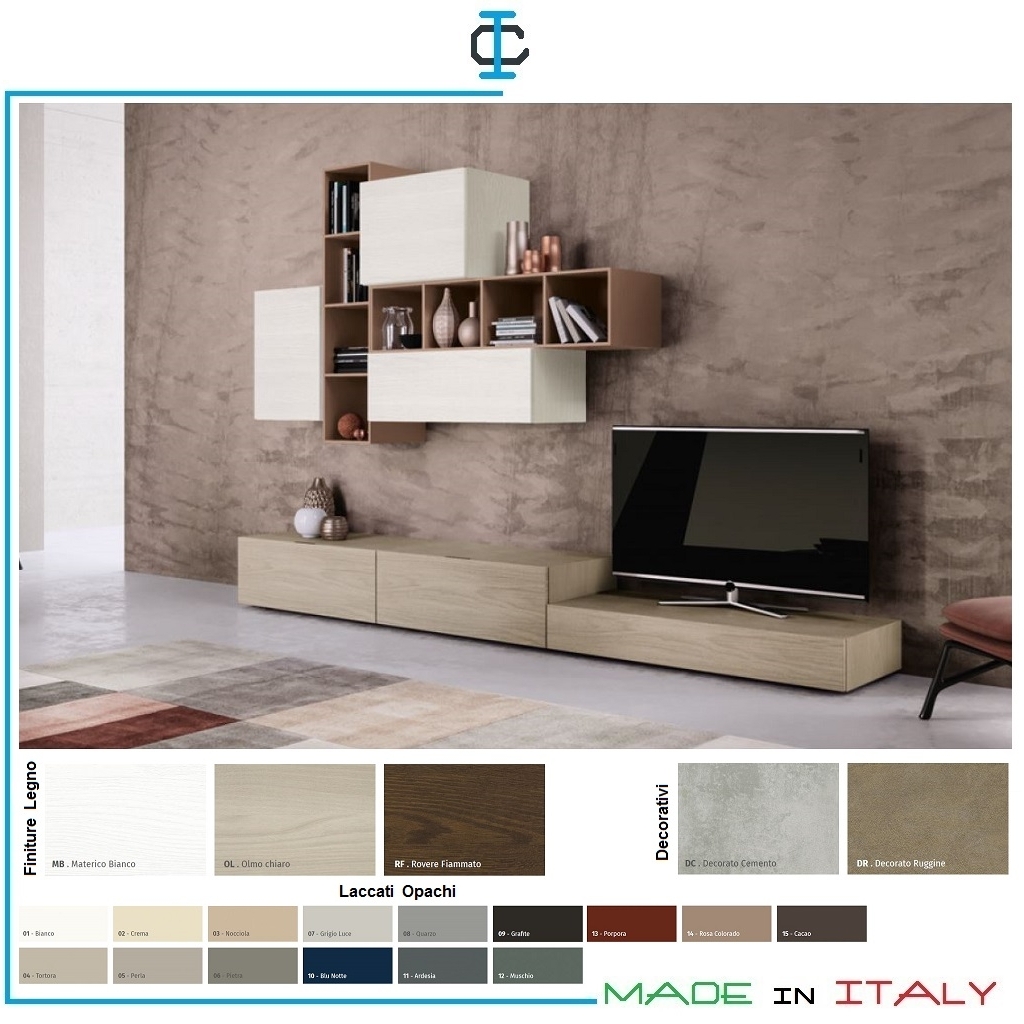 Parete soggiorno TV con libreria Rosa. Parete soggiorno in finitura Olmo chiaro, materico bianco e laccato rosa. Parete composta da : 3 pensili L.45 + 60 + 90 cm., 2 pensili a giorno L.30 + 120 cm., 2 cestoni L.90 cm., 1 cassetto L.120 cm. Soggiorni porta TV, in finiture e tinte a scelta, progettati e realizzati su misura, per ogni esigenza del cliente. Design Contemporaneo.