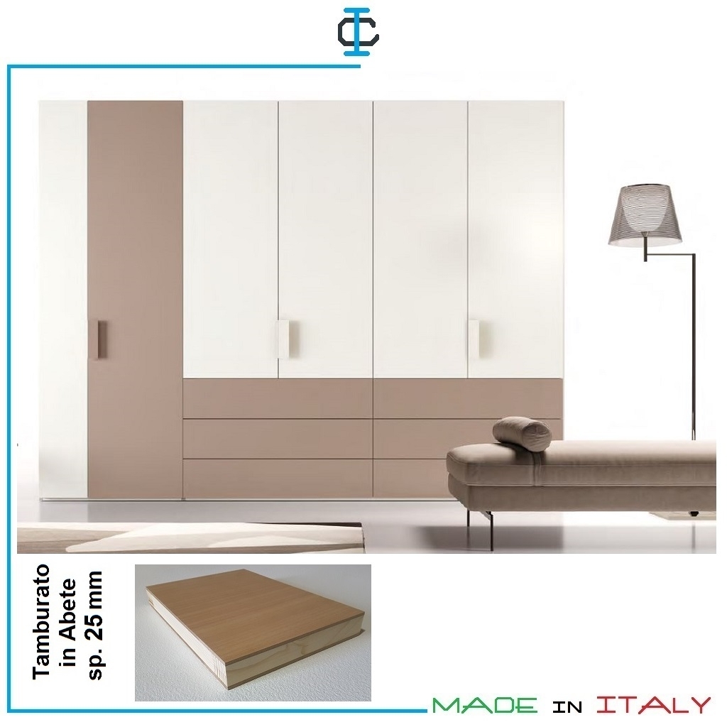 Armadi in tamburato con ante battenti e scorrevoli, componibili e su misura, personalizzabili in materiali, misure e colori.