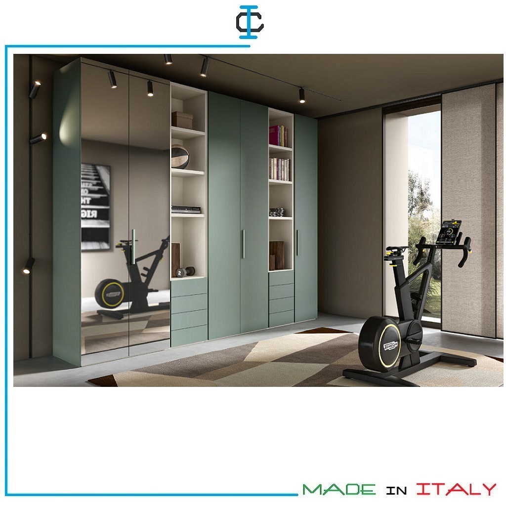 Armadio Fitness. Armadio composto da : 1 armadio specchio, 2 colonne con cassetti, 1 armadio 2 ante, 1 armadio 1 anta. Armadio con struttura in Pannello Ecologico in classe E1 in finitura con tinte a scelta. Stile Contemporaneo. Misure (cm): L.321 P.60 H.258