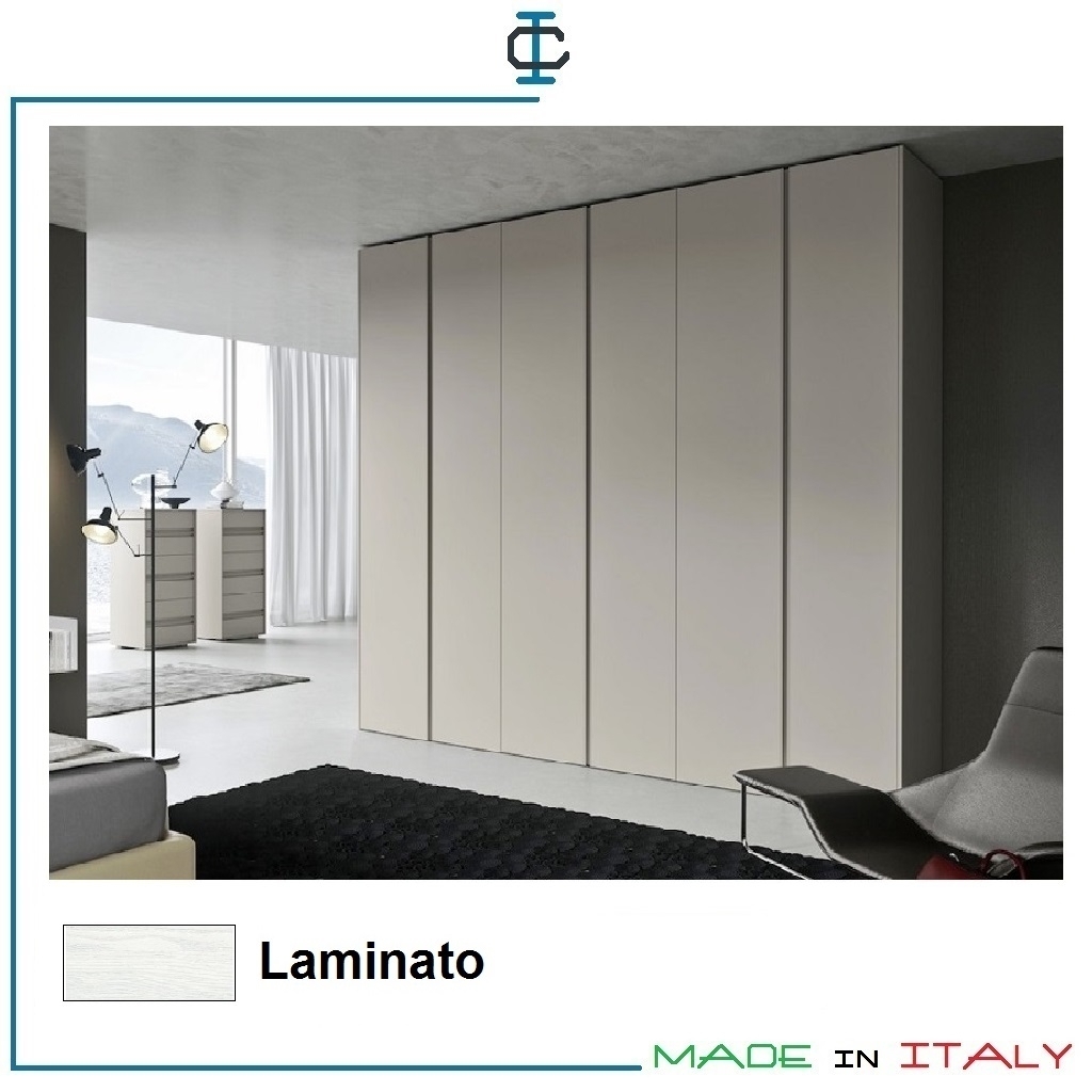 Armadio 6 ante battenti laminato componibile con maniglia a gola. Colori e misure personalizzabili. Possibilità di taglio a misura. Struttura in pannello ecologico certificato. Due tubi ed un ripiano inclusi per ogni singolo vano. Design Contemporaneo