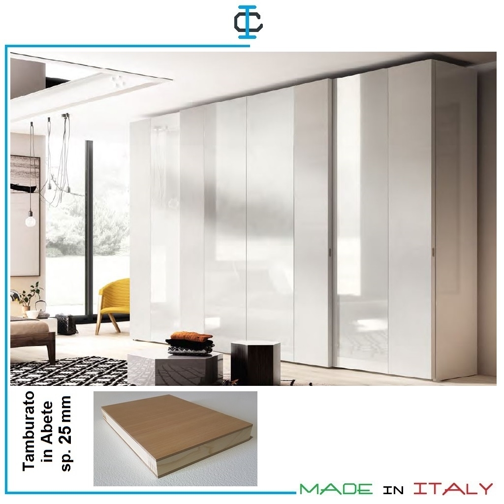 Armadio Laccato Lucido + Impiallacciato. Armadio 4 ante scorrevoli con struttura in legno tamburato sp. 25 mm. ed altezza cm. 257. Ante in finitura Laccato lucido Bianco + Impiallacciato Laccato Bianco. Armadio composto da : 4 ante L.89,5 cm. Attrezzatura : 2 tubi appendiabito ed 1 ripiano per ogni vano. Design Contemporaneo. Misure (cm): L.370,5 P.71,5 H.257