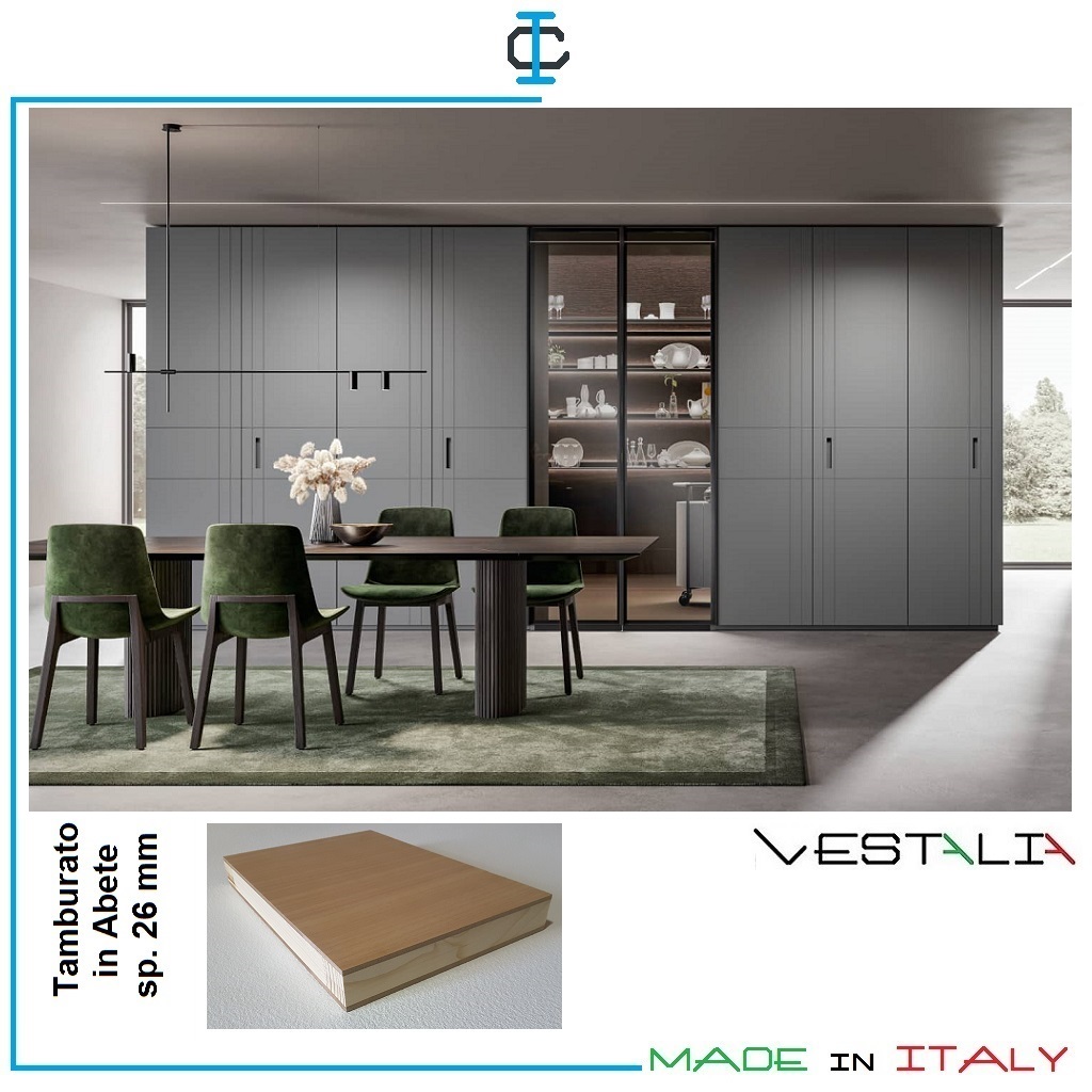 VESTALIA propone Armadi in legno tamburato di Abete o Legno Multistarto, componibili e su misura, personalizzabili in materiali, misure e colori.