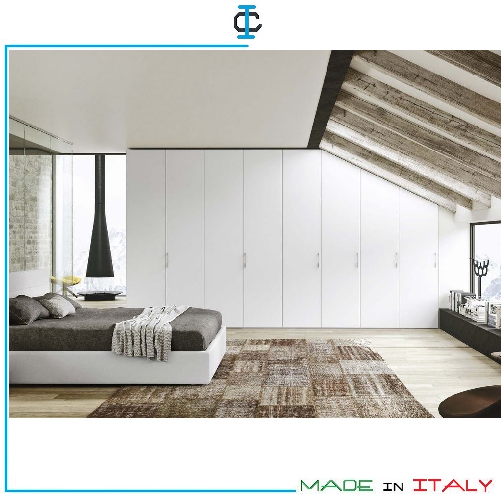 Armadio Mansardato. Armadio composto da : 2 armadi 2 ante, 4 armadi 1 anta. Armadio con struttura in Pannello Ecologico in classe E1, finitura con tinte a scelta. Stile Contemporaneo. Misure (cm): L.L.390 P.61 H.290 / 180