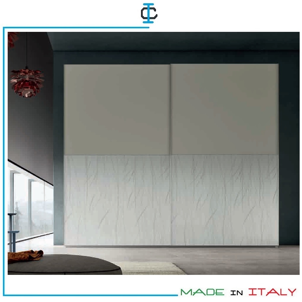 Armadi Scorrevoli Vetro con 2 ante con maniglia laterale. Armadio in stile moderno altezza cm.260. Finitura Laccato opaco Perla e Vetro Serigrafato Bianco. Armadi con possibilità di tinte a scelta. Struttura in pannello ecologico in classe E1. Due tubi ed un ripiano inclusi per ogni singolo vano. Design Contemporaneo