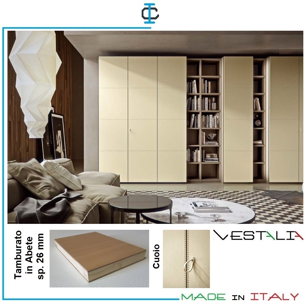 Armadio VESTALIA in cuoio. Armadio con 2 ante battenti, altezza cm. 290 . Armadi con struttura ed ante in tamburato di Abete sp. 26 mm. Armadio con ante in finitura cuoio con tinte a scelta . Armadio composto da : 2 armadi a 2 ante L.96 cm., 2 armadi 1 anta L.48 cm., 3 librerie a giorno. Attrezzatura per vano : 2 tubi appendiabito ed 1 ripiano. Armadi con ante battenti realizzati in tamburato di Abete sp. 26 mm, fianchi laccati, ripiani in tamburato d' Abete sp. 31 mm. Design Contemporaneo.