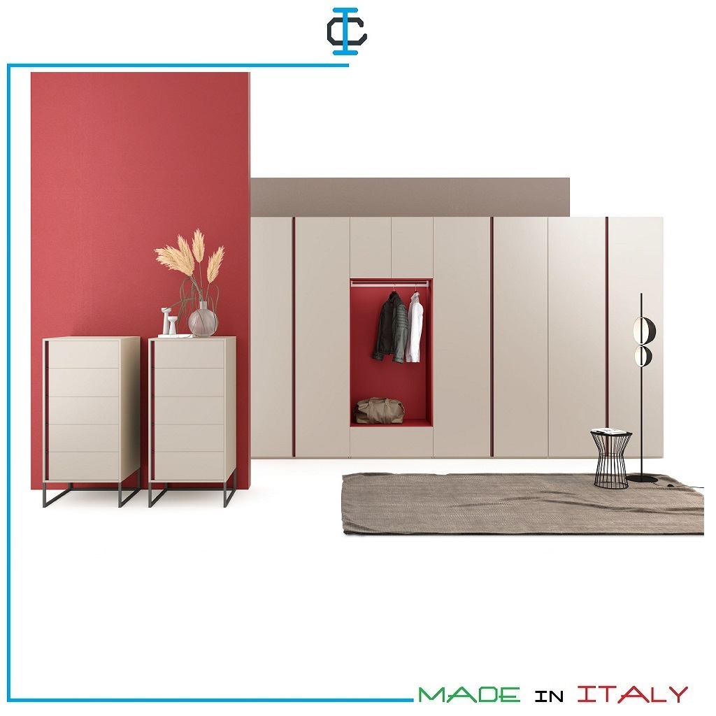 Armadio a giorno con Gola. Armadio composto da : 3 armadi 2 ante battente, 1 armadio a giorno con cassettone. Armadio con struttura in Pannello Ecologico in classe E1, finitura con tinte a scelta. Stile Contemporaneo. Misure (cm): L.453 P.60 H.259