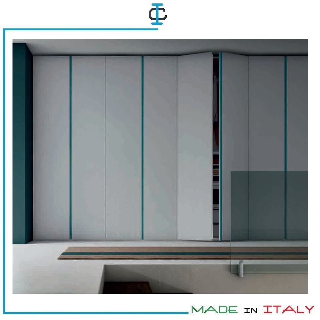 Armadi con Gola Laccata ad 8 ante battenti in stile moderno. Armadio h.258 in finitura venato laccato opaco polvere. Armadi con possibilità di tinte a scelta. Struttura in pannello ecologico in classe E1. Due tubi ed un ripiano inclusi per ogni singolo vano. Design Contemporaneo