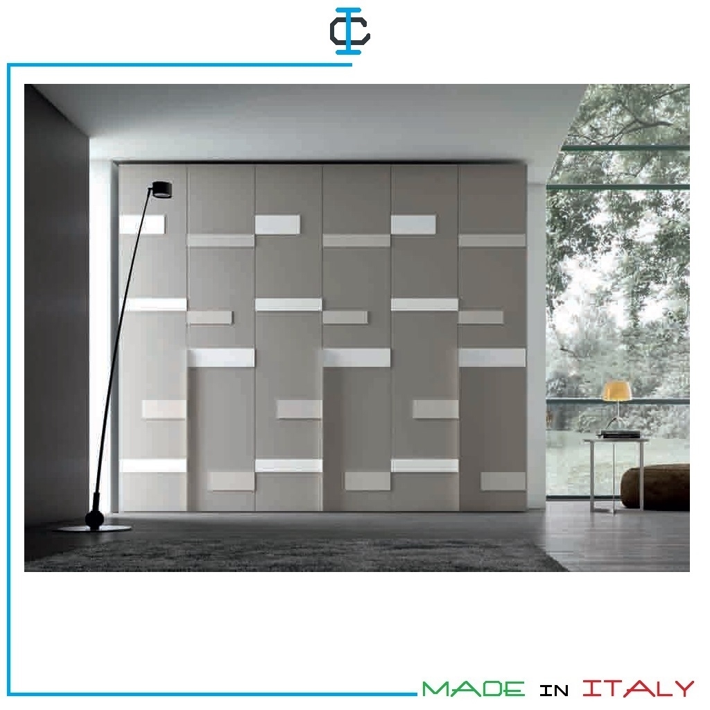 Armadio di Design con Inserti ad ante battenti, in finitura laccato opaco titanio. Armadio in stile moderno h.258. Armadi con possibilità di tinte a scelta. Struttura in pannello ecologico in classe E1. Due tubi ed un ripiano inclusi per ogni singolo vano. Design Contemporaneo