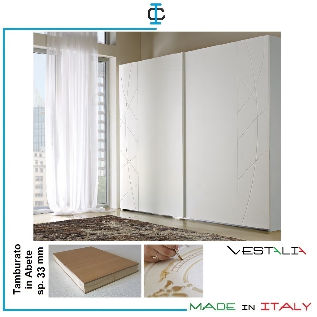 Armadio VESTALIA scorrevole con Intagli. Armadio con struttura in tamburato di Abete sp. 33 mm. ed altezza cm. 262, in finitura Laccato Bianco opaco. Armadio composto da : 2 moduli L.141 cm. Attrezzatura : 2 tubi appendiabito ed 1 ripiano per ogni vano. Stile Contemporaneo. Misure (cm): L.293 P.67 H.262