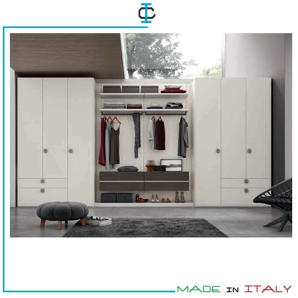 Armadi ad ante battenti con Cabine Boiserie a giorno H.292, in versione a 6 ante battenti e boiserie cabina al centro. Finitura Laccato opaco Perla, Rovere sbiancato. Armadio in stile moderno. Armadi con possibilità di tinte a scelta. Struttura in pannello ecologico in classe E1. Due tubi ed un ripiano inclusi per ogni singolo vano. Design Contemporaneo