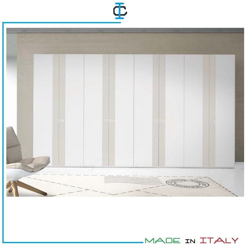 Armadio componibile modello Upline. Armadio componibile Upline in tinta bianco e canapa. Armadio bicolore con maniglia ad incasso H.259. Armadio componibile e personalizzabile. Armadio lineare composto da : 4 moduli ad ante battenti con tubi appendiabito e ripiani. Finitura Laminato con tinte a scelta. Armadio lineare in stile contemporaneo. Struttura in pannello ecologico in classe E1 a basso contenuto di formaldeide.