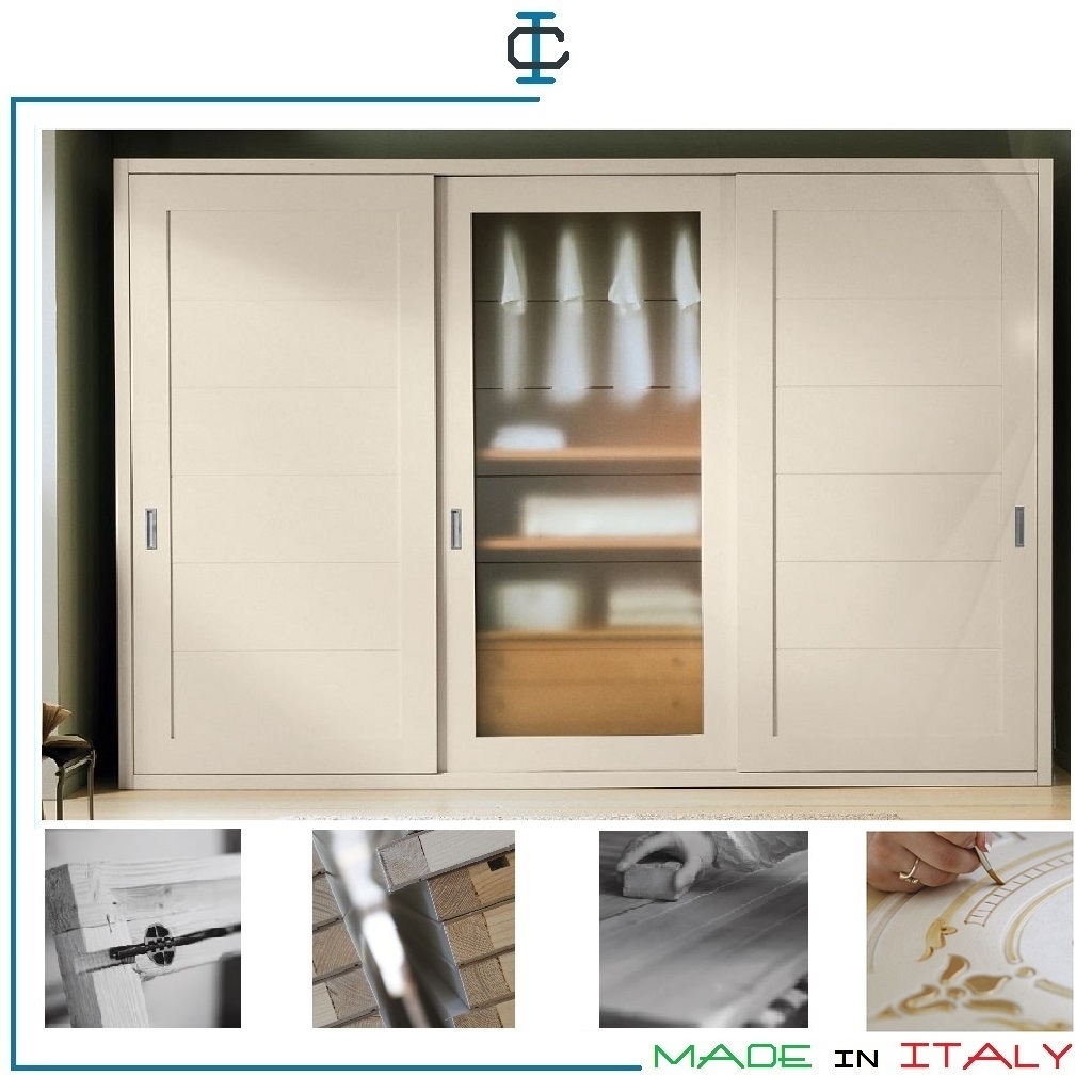 Armadio Scorrevole Laccato. Armadio con struttura ed ante in tamburato di Abete sp. 35 mm. Armadio con altezza cm. 252. Armadio scorrevole in finitura laccato opaco. Armadio composto da : 3 colonne da 100 cm. Attrezzatura : 2 tubi appendiabito ed 1 ripiano per ogni vano. Design Contemporaneo.