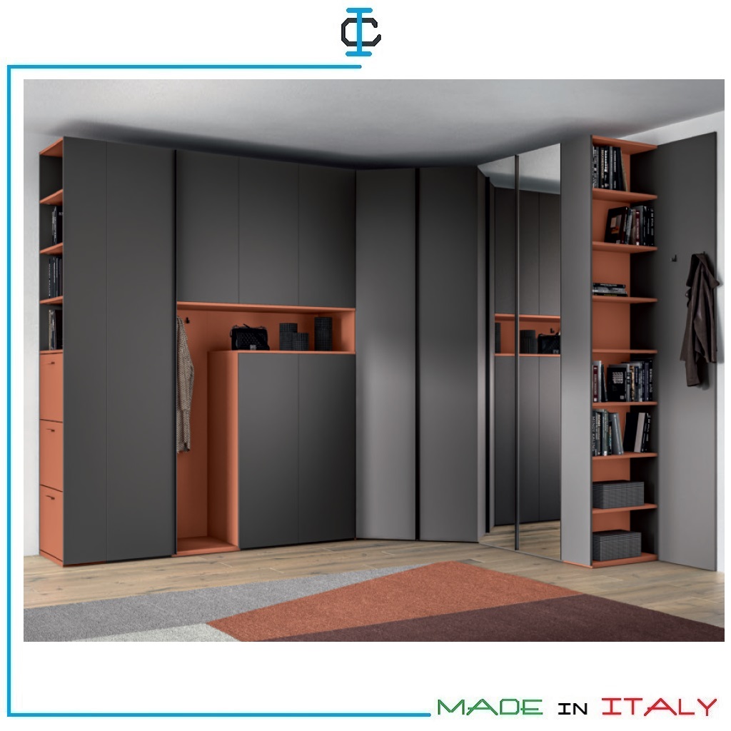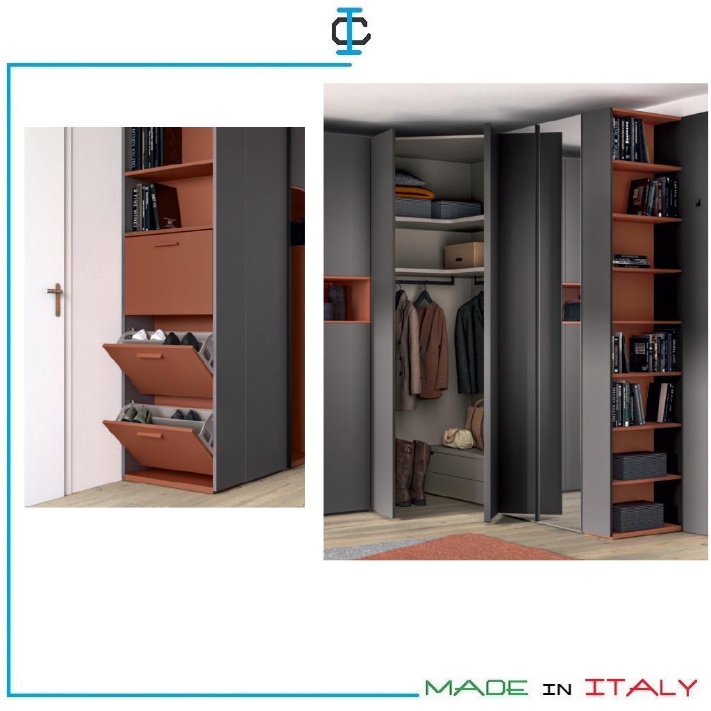 Armadio Spogliatoio con scarpiera. Armadio composto da : 1 scarpiera con libreria, 1 armadio 3 ante, 1 armadio spogliatoio angolo, 1 armadio specchio, 1 libreria, 1 pannello. Armadio con struttura in Pannello Ecologico in classe E1 in finitura con tinte a scelta. Stile Contemporaneo. Misure (cm): L.350 x 290 P.60 H.258