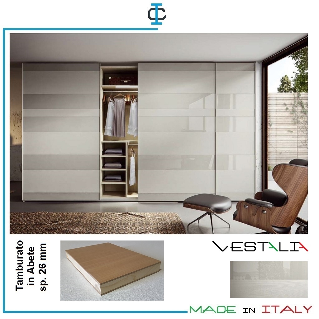 VESTALIA progetta e produce armadi in legno tamburato scorrevoli con possibilità di realizzazione su misura e con finiture e tinte a scelta.