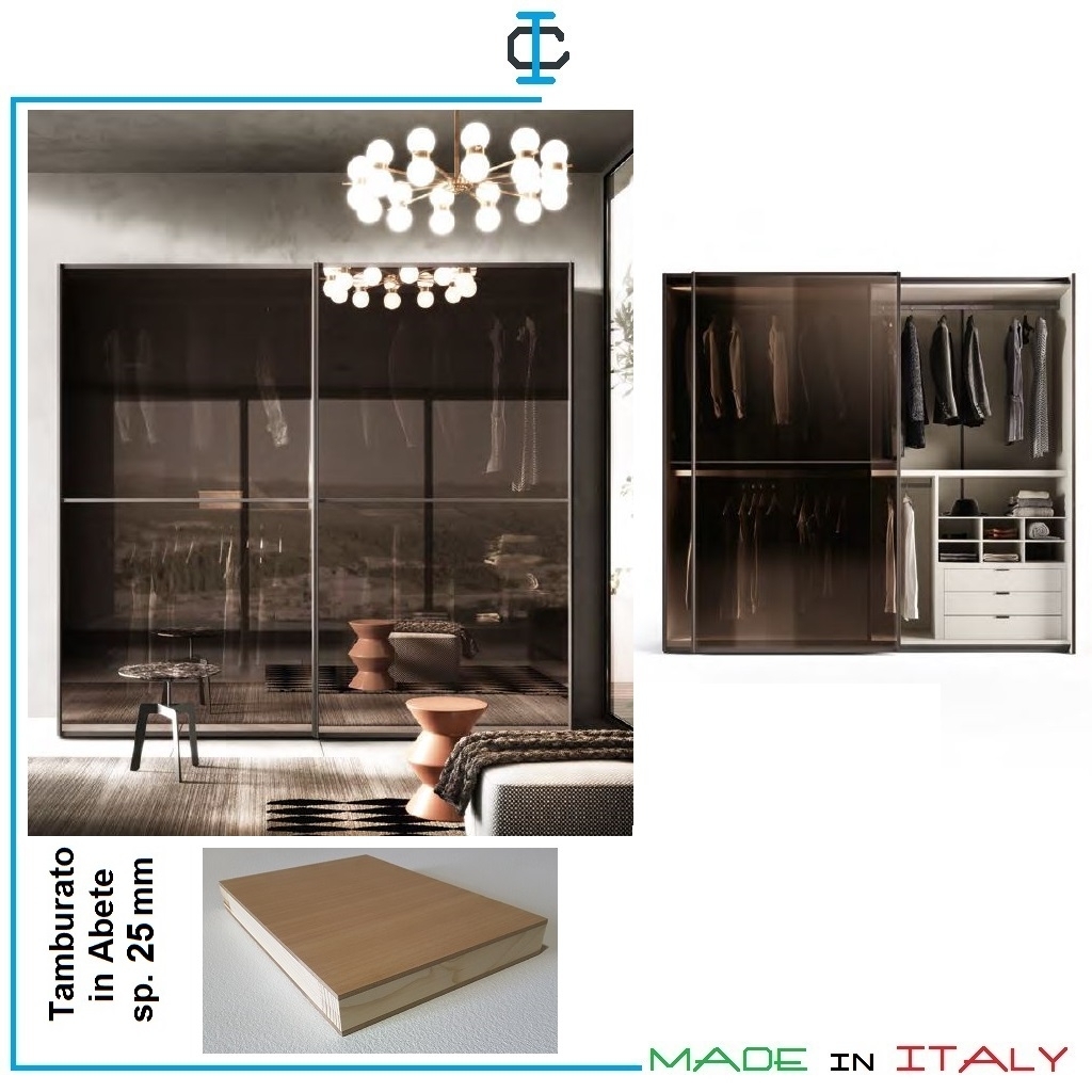 Armadi in tamburato con ante battenti e scorrevoli, componibili e su misura, personalizzabili in materiali, misure e colori.