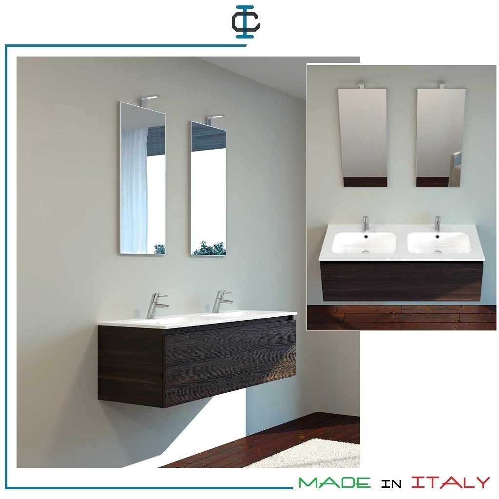 Arredo Bagno con doppio lavabo. Mobile bagno moderno completo di 2 lavabi, specchiera e faretti led. Struttura realizzata con pannelli Idropan V100 idrofughi verniciato con prodotti ecologici antibatterici. Prezzo composizione come foto, miscelatore escluso. Misure (cm): L.120 P.46 H.174