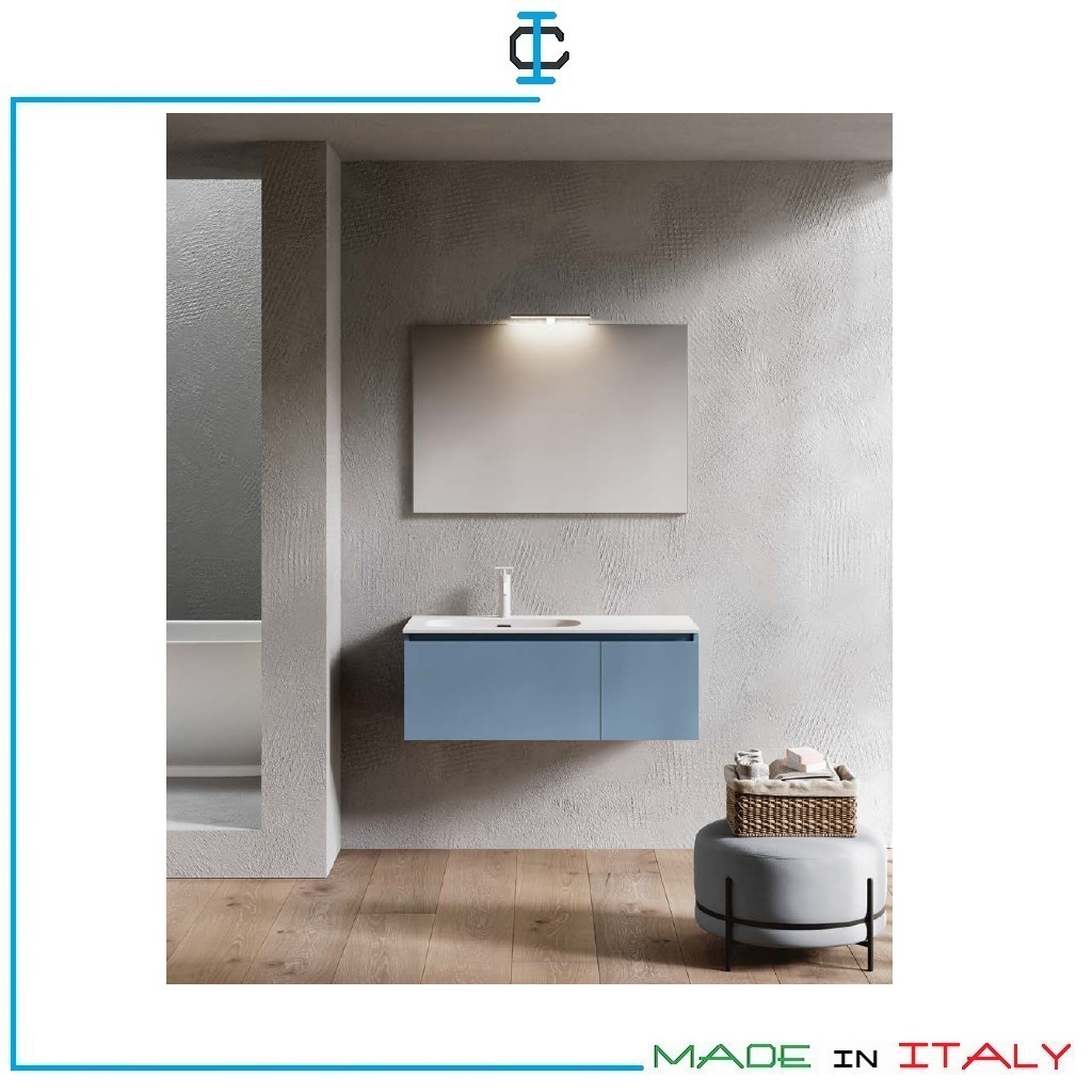 Mobile bagno sospeso con 2 cesti. Tinta Laccato fiordaliso con gola. Mobile completo di : base 2 cesti, Lavabo tuttopiano mineral opaco con vasca a destra o a sinistra, specchio, led. Struttura in pannello idrofugo in classe E1. Design Contemporaneo.