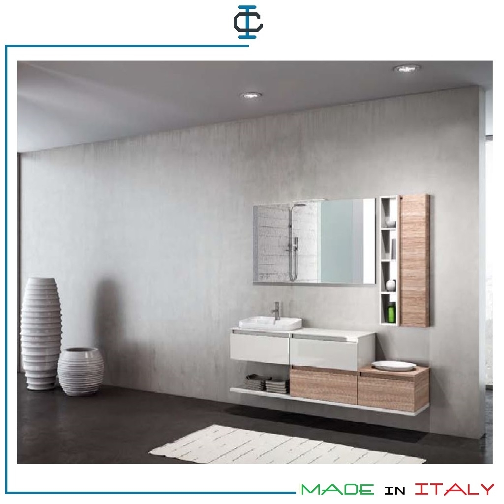 Arredo bagno completa di un mobile da bagno con cestoni sospesi, lavabo consolle in Mineral, specchio, lampada e pensile a giorno. Ideazione, produzione e design Made in Italy. Finiture: Laccato bianco lucido \ Laminato olmo rosso. Strutture realizzate in pannello idrofugo V100.
