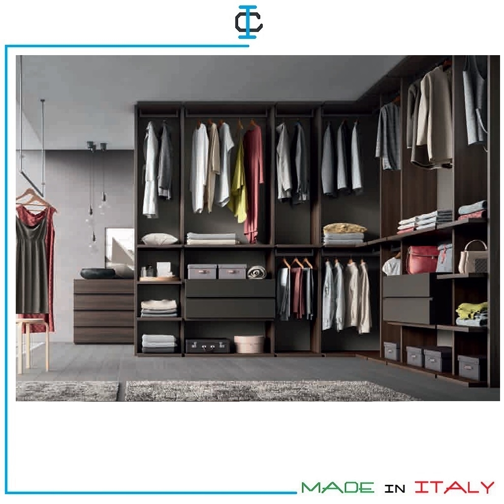 Cabina Armadio angolare H. cm. 240. Cabina Armadio in stile moderno con tubi, ripiani e cassetti. Finitura Olmo scuro, Laccato opaco Visone. Cabine Armadio con possibilità di tinte a scelta. Struttura in pannello ecologico in classe E1. Design Contemporaneo