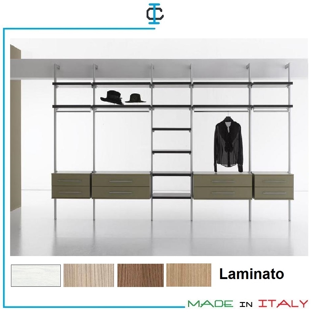 Cabina Armadio Lineare in stile moderno con struttura portante in alluminio . Composizione completa di cassetti, ripiani e tubi appendiabito. Finitura in laminato con tinte a scelta. Struttura in pannello ecologico certificato E1. Possibilità di progettazione cabine su misura. Design Moderno