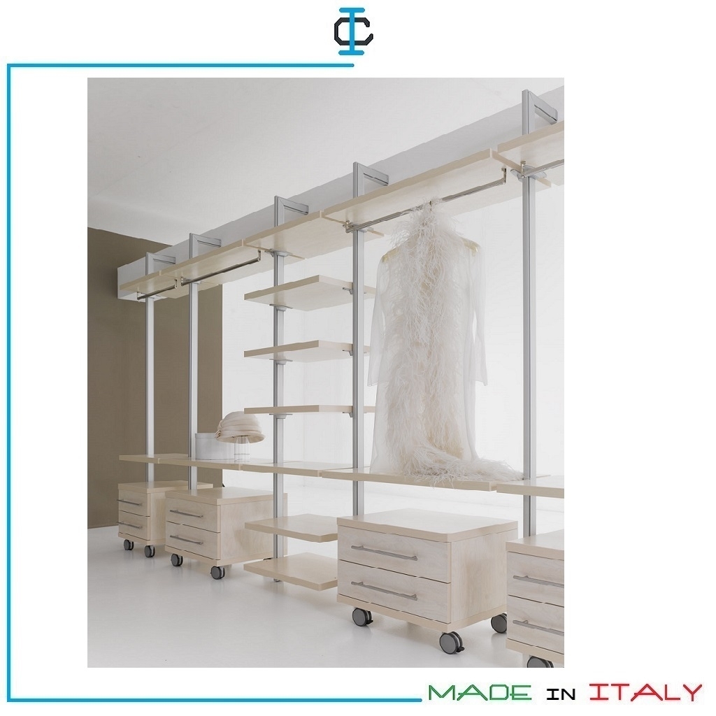 Cabina Armadio con cassettiere a ruote , in stile moderno con profili portanti in alluminio alti.3 metri . Composizione lineare, completa di cassetti, ripiani e tubi appendiabito. Finitura in laminato con tinte a scelta. Struttura in pannello ecologico certificato. Possibilità di progettazione cabine su misura. Design Moderno