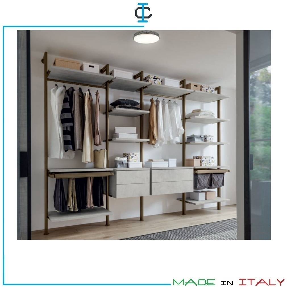 Cabina Armadio finitura Bronzo. Cabina Armadio con montanti a parete in finitura Bronzo, mensole e cassettiere in HPL Cimant Ash. Cabina Armadio composta da : 5 montanti h.250 cm., 9 mensole L.90 cm., 3 mensole L.60 cm., 2 cassetti L.90 cm., 2 cassetti L.60 cm., 2 tubi, 1 portapantaloni, 1 cesto. Cabine Armadio con finiture e tinte a scelta, progettate e realizzate su misura, per ogni esigenza del cliente. Design Contemporaneo. Misure (cm): L.355 P.55 H.250