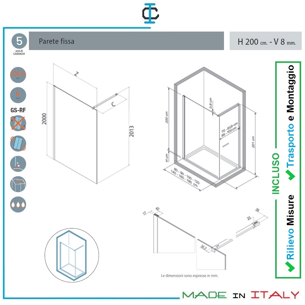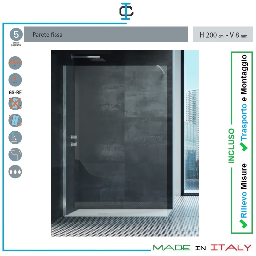 Plus di prodotto : • 2 cm di regolazione del fuorisquadra • Prodotto reversibile • Profili verticali con fissaggio a pinza (gestione dell’estensibilità nascosta) • Paretine di combinazione per abbinamenti (solo per 8 mm) • Porte di chiusura dedicate • Barre accessorie per diverse configurazioni • Anticalcare compreso nel prezzo • Stampa digitale disponibile su tutti i vetri piani TR e TG