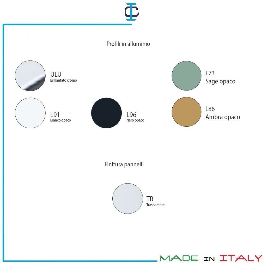 Profilo a scelta : Cromo , Bianco opaco, Nero opaco, Ambra opaco, Sage opaco. Vetro Trasparente.