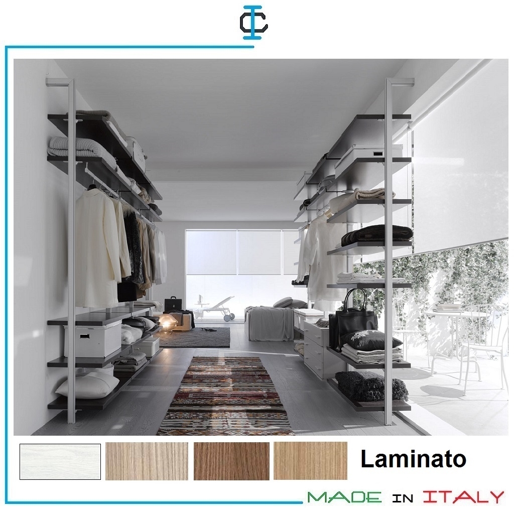 Cabine Armadio moderne con profili in alluminio satinato . Composizione modulare completa di cassetti, ripiani e tubi appendiabito. Finitura in laminato con tinte a scelta. Struttura in pannello ecologico certificato. Possibilità di progettazione cabine su misura. Design Moderno