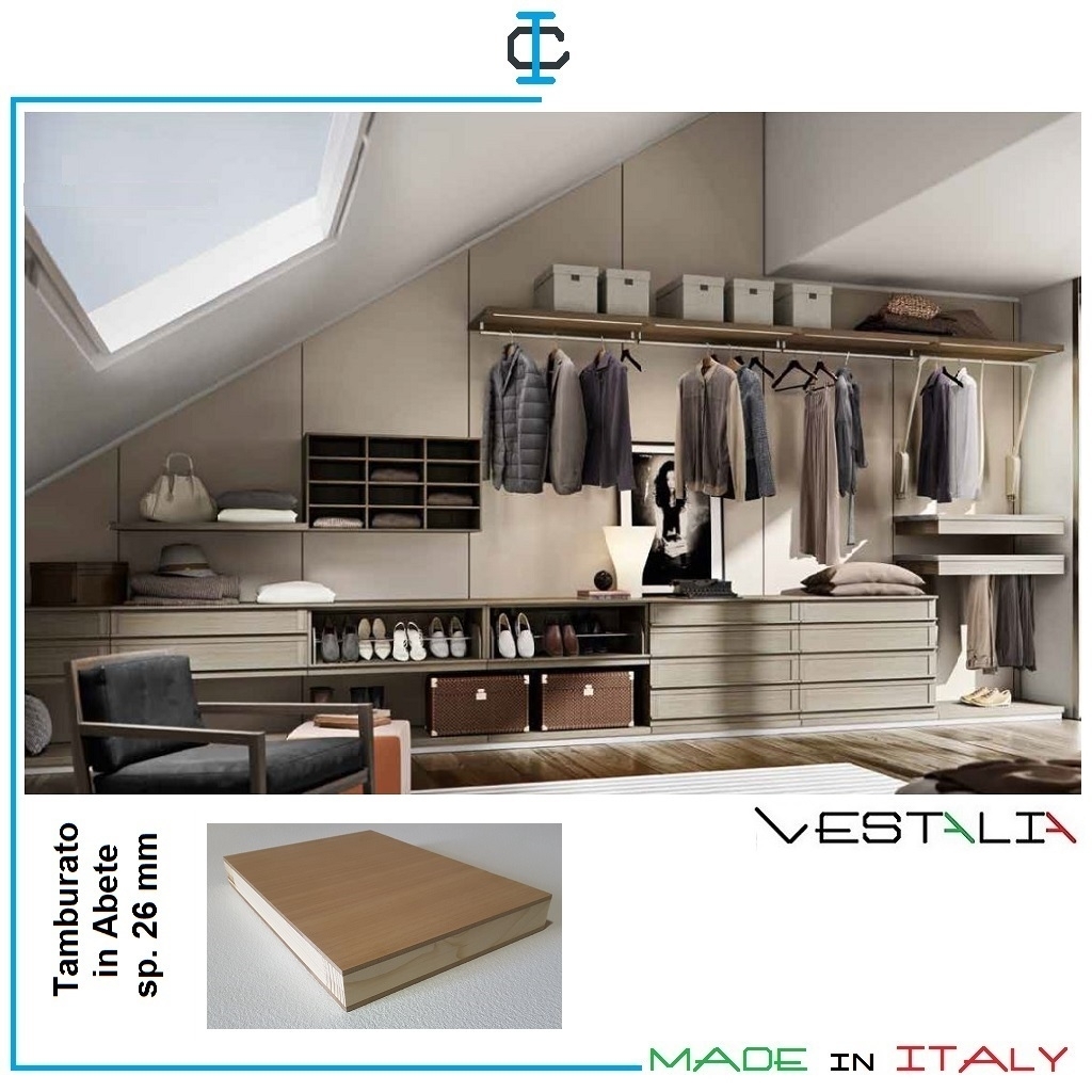 VESTALIA produce Cabine Armadio in tamburato per mansarde personalizzabili in materiali, misure e colori.