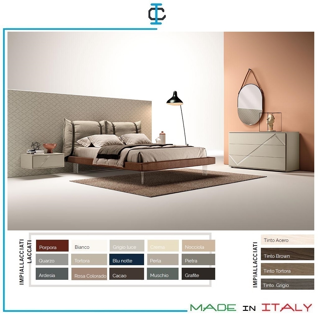 Camera da Letto con comodini sospesi. Camera matrimoniale con comò e comodini in finitura Laccato opaco Porpora, letto con cuscini e giroletto rivestiti in tessuto . Camera composta da : 1 letto imbottito, 1 comò, 2 comodini. Stile Contemporaneo. Misure (cm): Comò L.127 P.54 H.76 Comodino L.58 P.45 H.25 Letto L.190 P.210 H.103