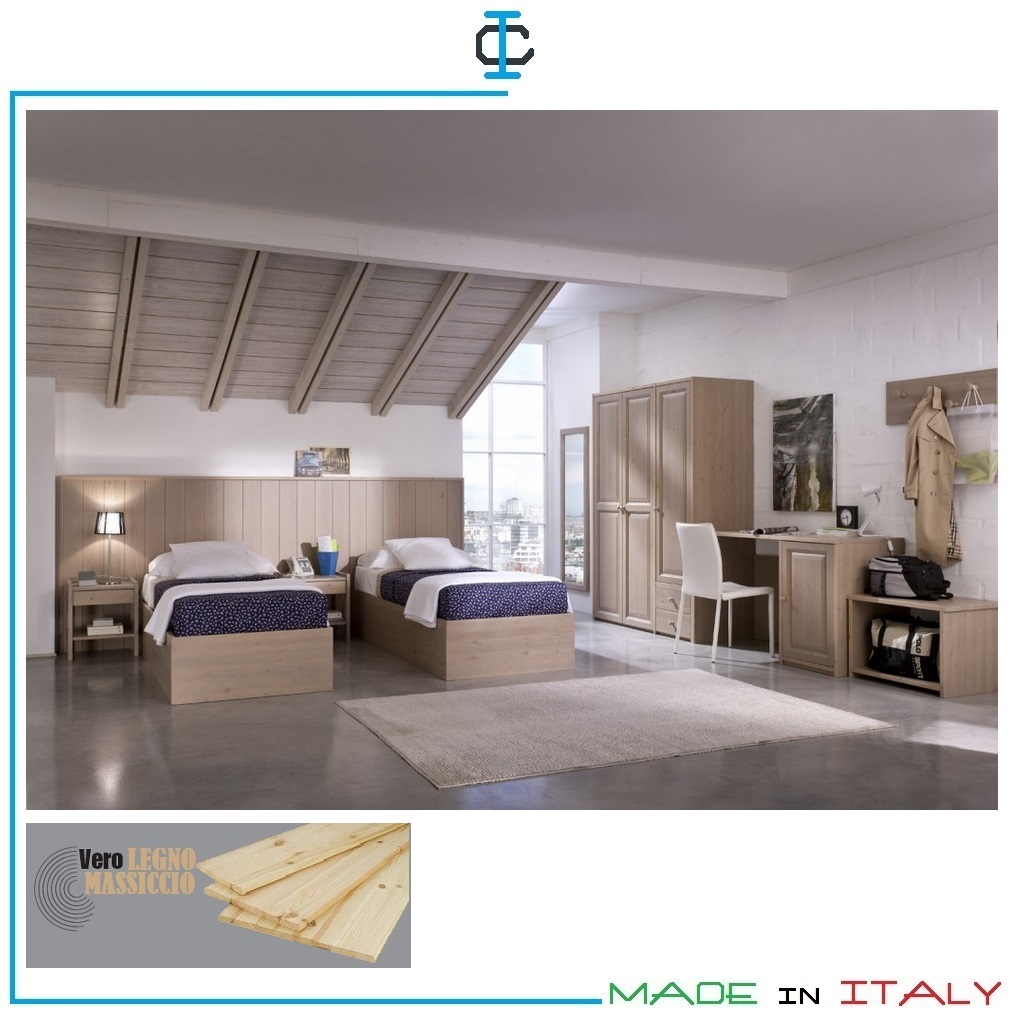 Cameretta con 2 Letti in Pino massello, mod. Hotel 6. Letti, comodini, scrittoio, ante armadio, realizzate in Pino massello sp. 25 mm.,in finitura Naturale. Cameretta composta da : 2 pannelli testiera, 2 letti singoli, 2 comodini, 1 scrittoio, 1 portavaligie, 1 armadio 3 ante, 1 cappelliera. Attrezzatura : 1 tubo appendiabito per ogni vano. Stile Rustico. Misure (cm): Armadio L.154 P.62 H.200 Pannello testiera L.300 P.5 H.100 Letto L.86 P.201 H.35 Comodino L.44 P.36 H.53 Scrittoio L.140 P.60 H.75 Portavaligie L.75 P.45 H.45 Cappelliera L.80 H.27
