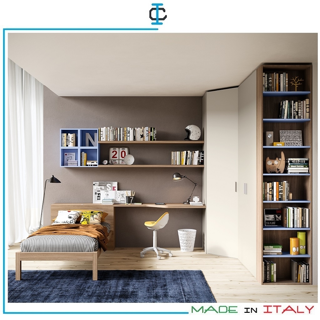 Cameretta angolare moderna composta da : letto singolo , scrivania,mensole, pensile libreria, armadio angolare, libreria terminale. Struttura in pannello ecologico classe E1. Prezzo composizione come foto. Design Contemporaneo. Rete e materasso opzionali.