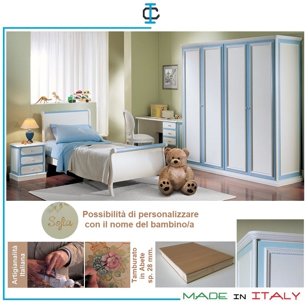 Cameretta con letto a Barca. Cameretta realizzata in legno tamburato sp. 28 mm., in finitura tinta Beige decapè ed Azzurro decapè. Cameretta composta da : 1 armadio, 1 letto , 1 comodino, 1 scrivania, 1 sedia. Attrezzatura : 1 tubo appendiabito per ogni vano. Stile Romantico-Barocco. Misure (cm): Armadio L.207 P.60 H.220 Letto L.93 P.213 H.100 Scrivania L.130 P.65 H.78 Comodino L.50 P.36 H.50 Escluso : Rete, Materasso (85x190), accessori.