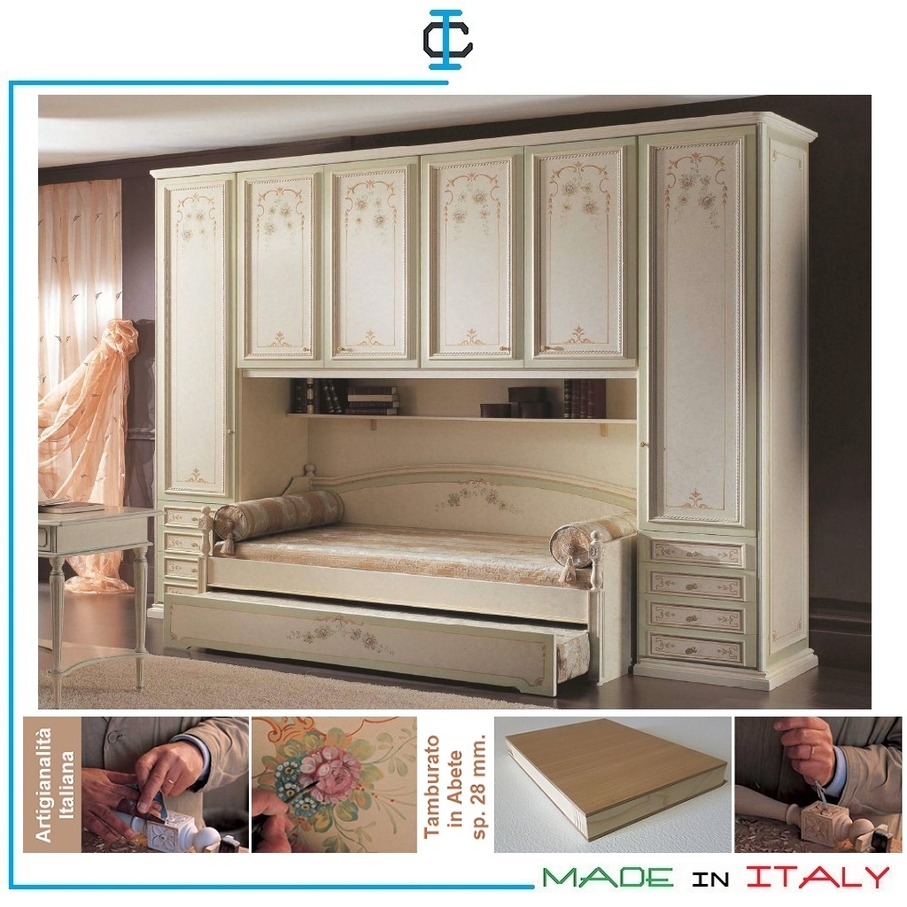 Cameretta Ponte con divano letto. Cameretta realizzata in legno tamburato sp. 28 mm., in finitura tinta Avorio marmo, Verde oriente tempera, filetto Dorato, decorato a mano. Cameretta composta da : 1 armadio ponte, 1 divano letto. Attrezzatura : 1 tubo appendiabito per ogni vano. Stile Romantico-Barocco. Misure (cm): Armadio Ponte L.314 P.60 H.260 Divano L.201 P.92 H.95 Escluso : Materasso (superiore 80x190 h.20, inferiore 80 x 185 h.18 ), cuscini, copriletti, scrittoio, accessori.