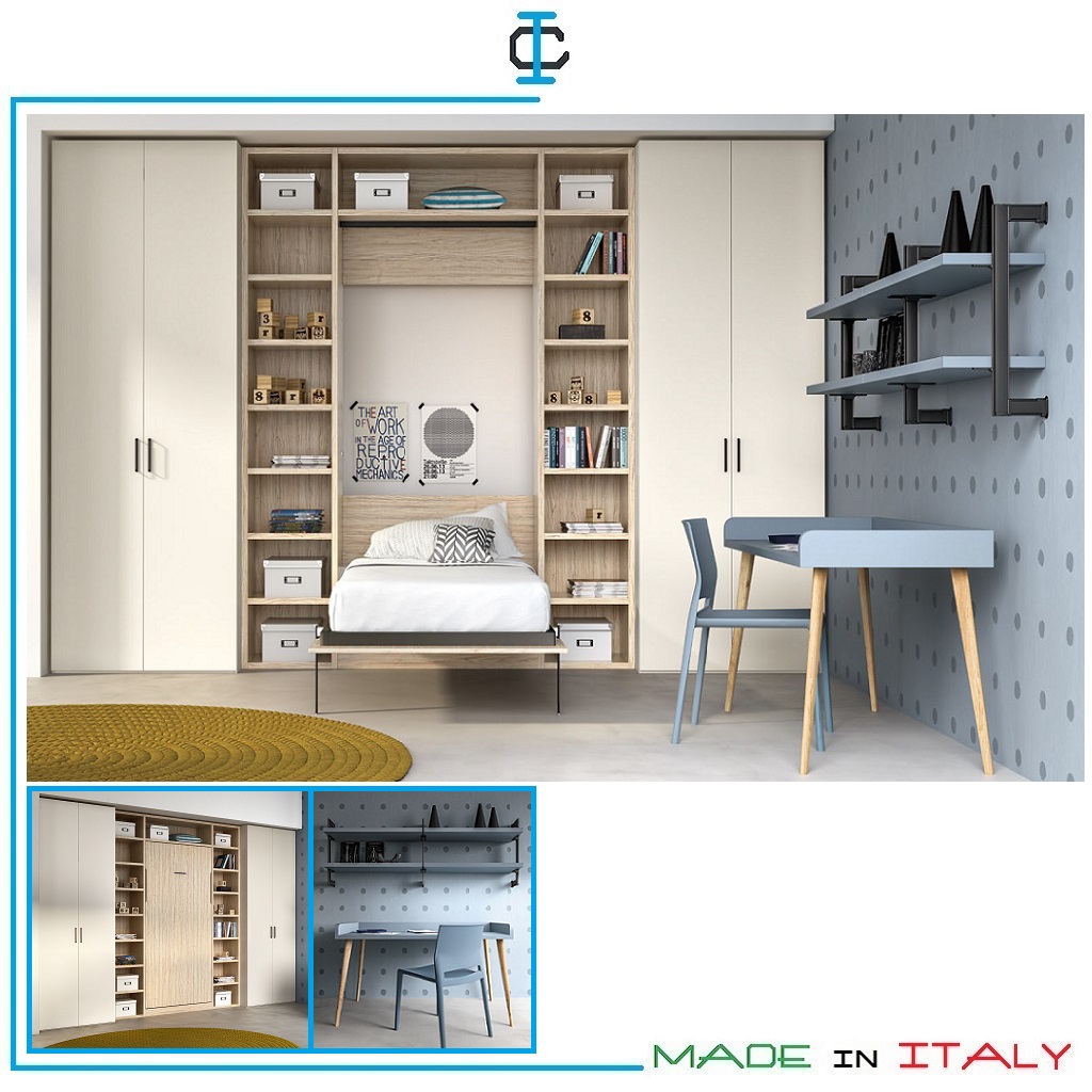 Cameretta con Letto a Scomparsa. Cameretta composta da : armadio libreria, letto a scomparsa, scrittoio, mensole. Cameretta con struttura in Pannello Ecologico in classe E1 in finitura con tinte a scelta. Stile Contemporaneo. Misure (cm): Armadio Libreria e Letto L.375 P.60 H.258 (rete e materasso 80 x 190)