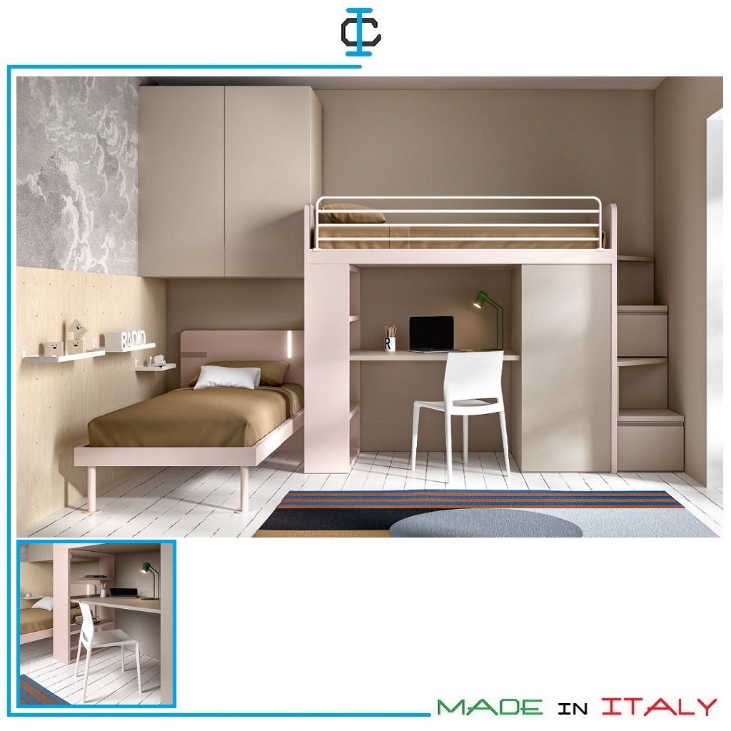 Cameretta con studio. Cameretta 2 letti composta da : letto, zona studio, sclala, letto soppalco con armadio, mensole. Cameretta con struttura in Pannello Ecologico in classe E1 in finitura con tinte a scelta. Stile Contemporaneo. Misure (cm): L.372 P.127 H.258