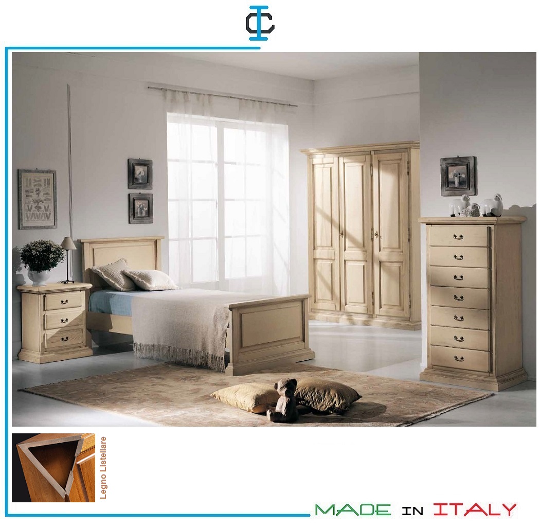 Cameretta decapè Avorio. Cameretta con settimino, armadio, letto e comodino. Armadio con struttura in Legno Listellare impiallacciato Castagno, finitura Laccato opaco con tinte a scelta. Lavorazione artigianale realizzata a mano, quindi ogni elemento è UNICO e non replicabile. Stile Classico. Misure (cm): Armadio L.167 P.62 H.207 Letto L.101 P.213 H.106 Settimino L.69 P.48 H.123 Comodino L.57 P.40 H.67