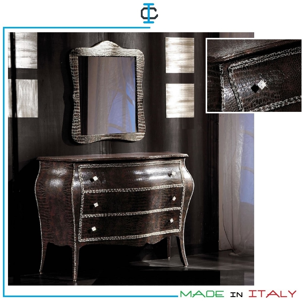 Comò tappezzato bombato in stile classico, per camera da letto, soggiorno, disimpegno o altro ambiente da valorizzare. Realizzato in legno massello e multistrato. Finitura in tessuto con pomolo in cristallo Swarovski. Mobili realizzati da falegnami qualificati in Italia. Specchiera opzionale.