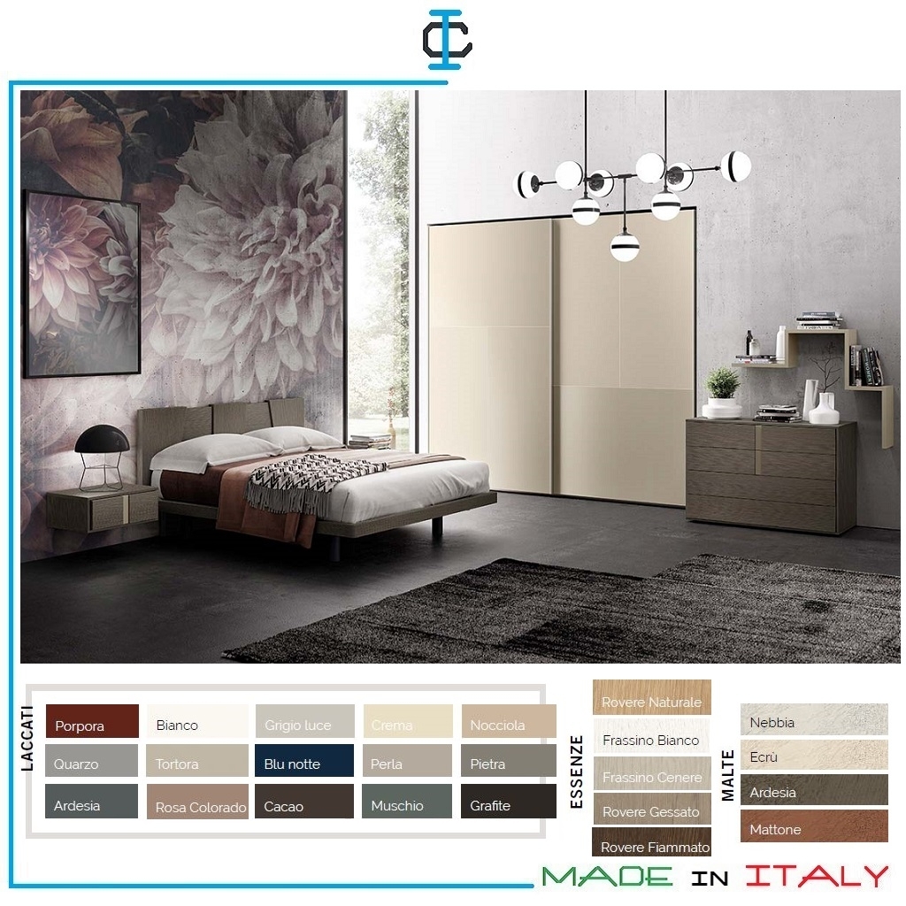 Comò con comodini sospesi. Gruppo notte con maniglia verticale centrale, finitura impiallacciato Acero tinta Grigio e laccato opaco Tortora. Guide cassetti con Push & Pull. Gruppo notte, composto da : 1 comò a 4 cassetti , 2 comodini sospesi ad 1 cassetto. Design Contemporaneo.