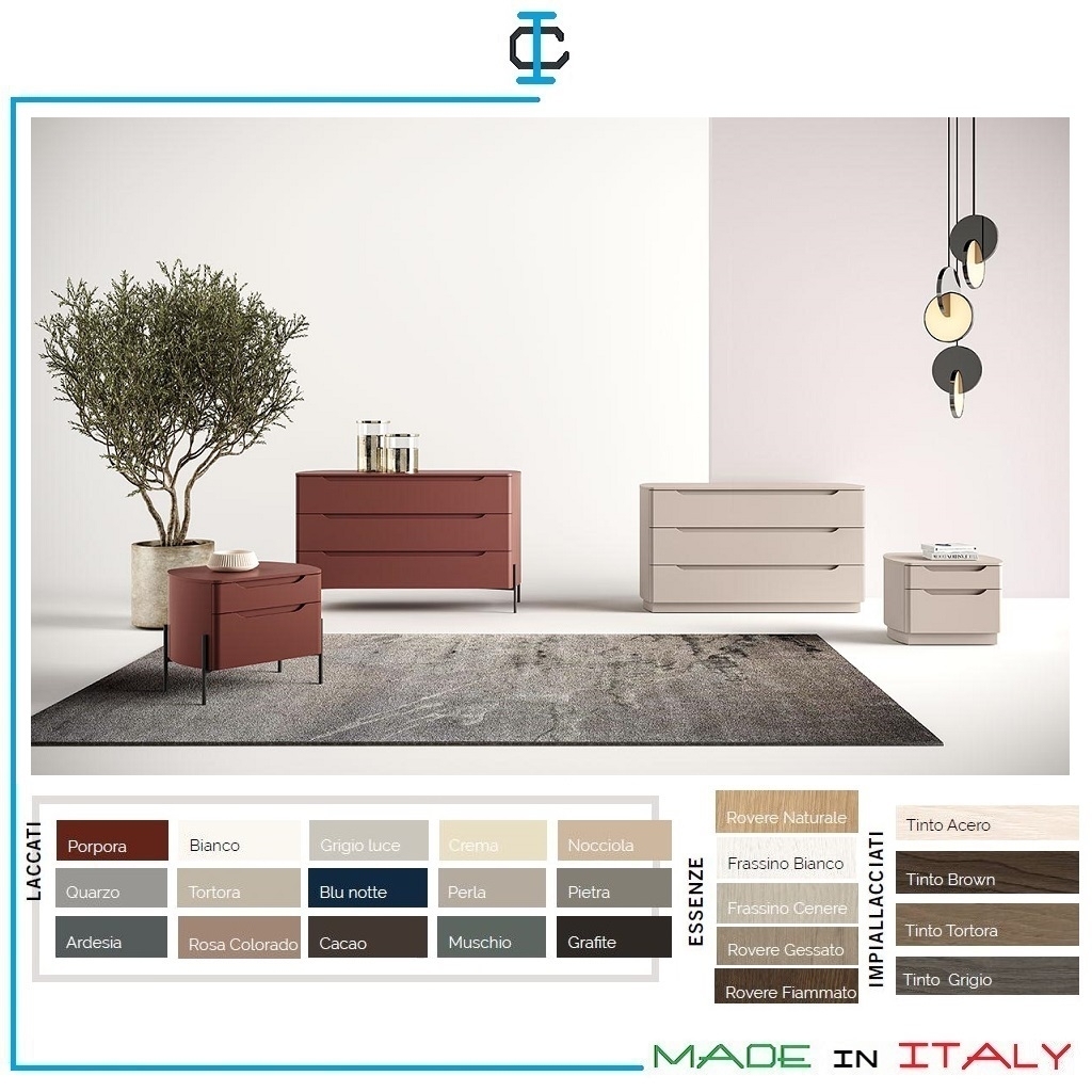 Comò e comodini Curvi. Gruppo notte con fianchi in legno listellare curvato, finitura Laccato Opaco con Gola. Guide cassetti con Stop-control e Sylent system. Gruppo notte, composto da : 1 Comò con 3 cassetti, 2 comodini con 2 cassetti. Design Contemporaneo.