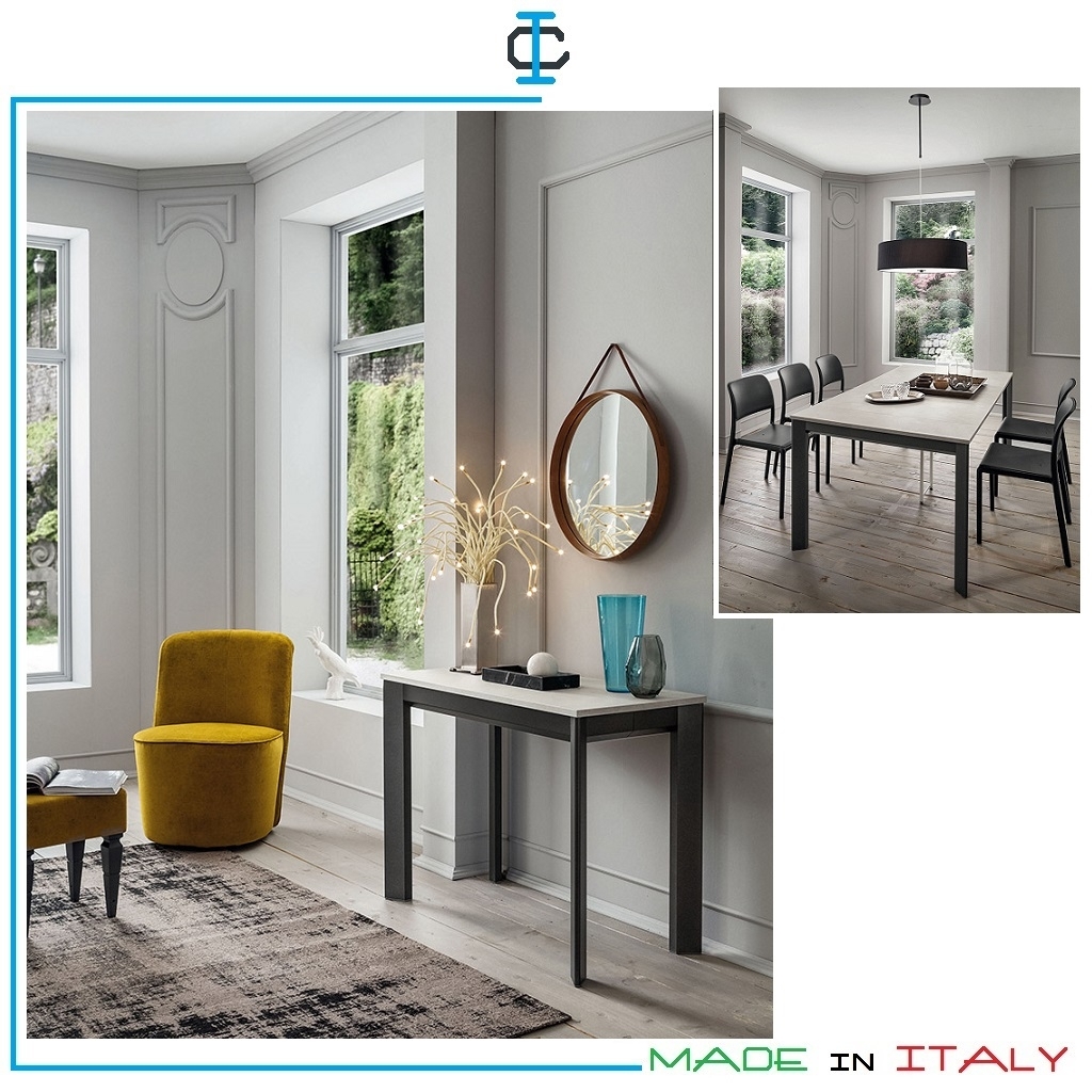 Consolle apribile con piano in HPL Cimant Ash, stile moderno, composto da: Gambe in alluminio verniciato a polveri epossidiche, guide in alluminio, gamba centrale, piano in HPL. Materiali e produzione Made in Italy.