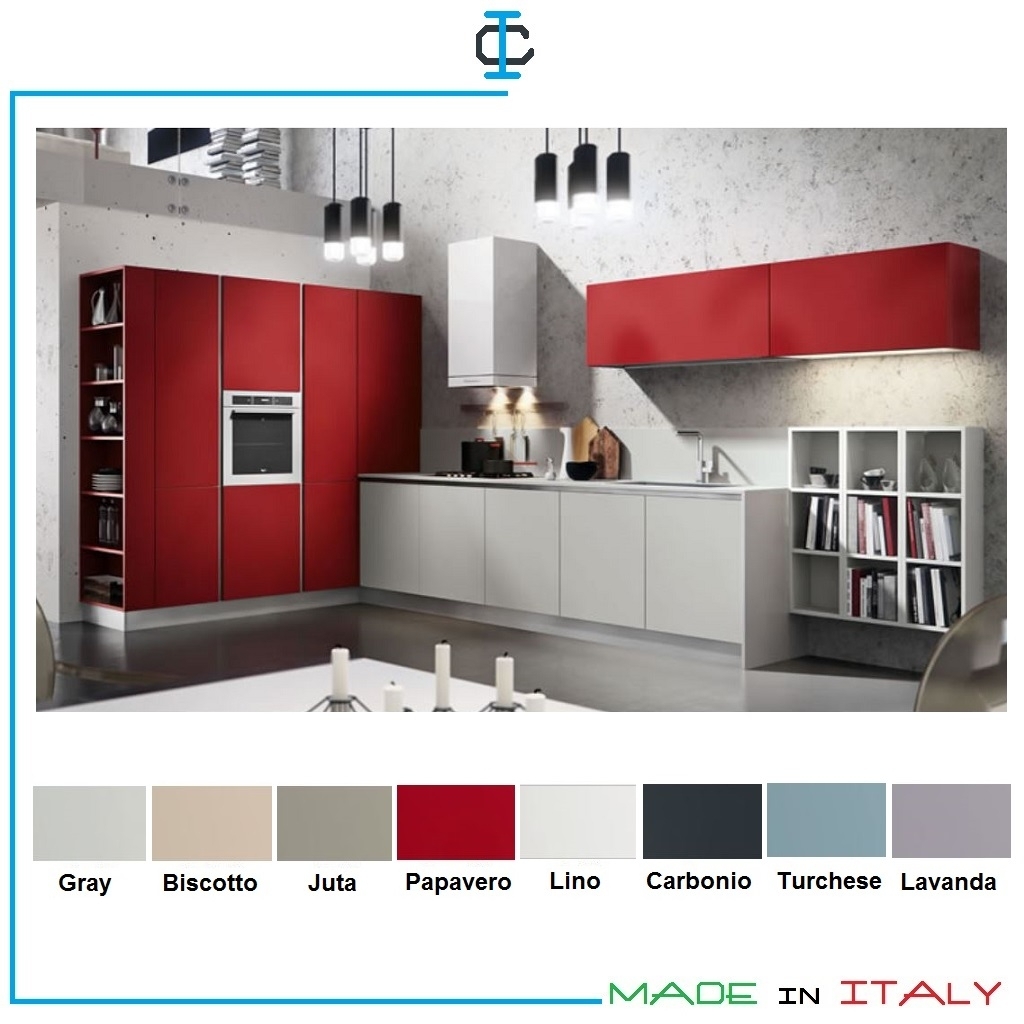 Cucina angolare laccata opaca, moderna . Composta da : Colonna libreria terminale, colonna frigo, colonna forno, colonna dispensa angolo, zona lavello, zona cottura, pensili. Finitura in laccato opaco con tinte a scelta. Materiali strutturali a scelta e colori configurabili. Design Contemporaneo.