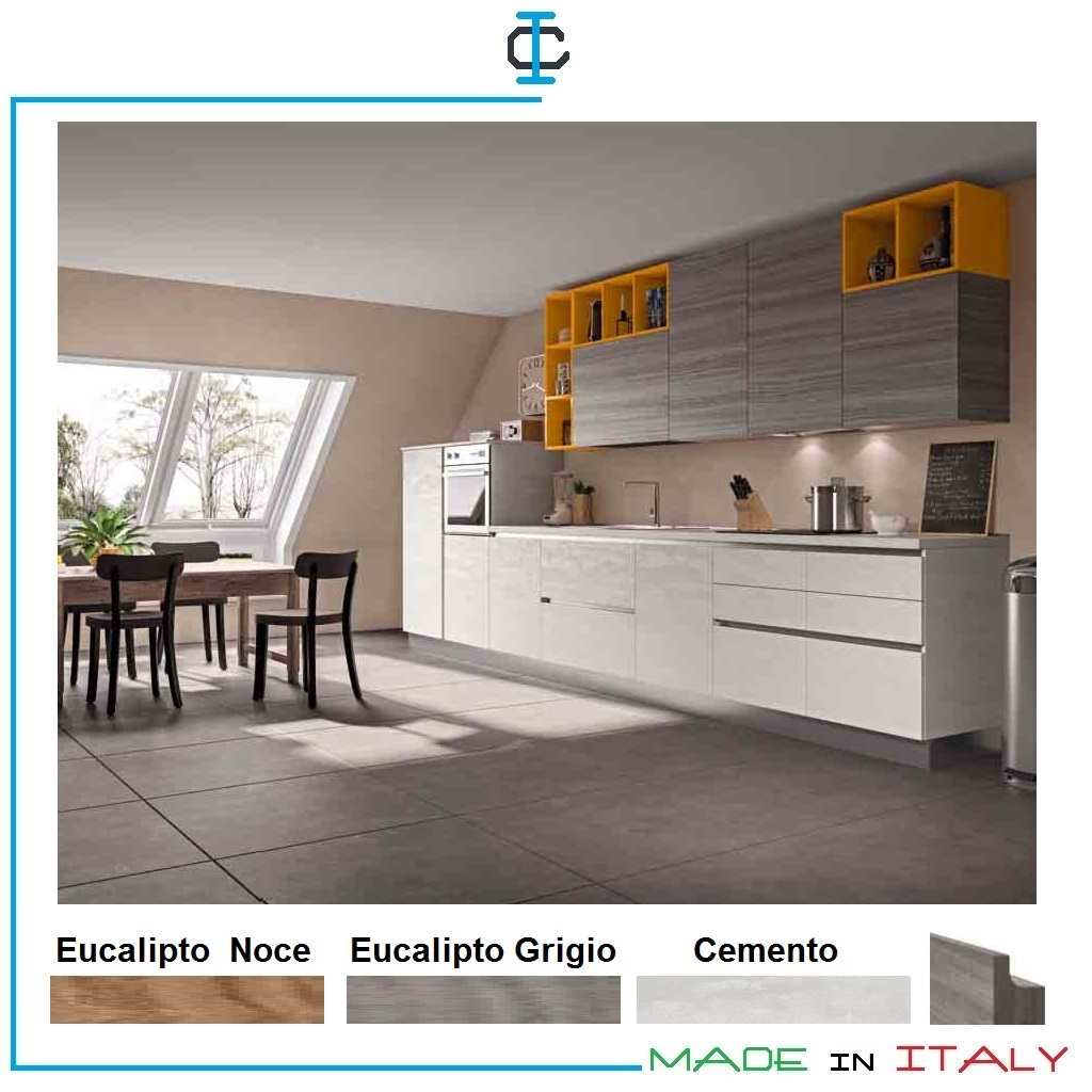 Cucina con Pensili Laccati, in stile moderno, apertura a gola. Composta da : Colonna frigo, colonna forno, zona lavello con cestoni, zona cottura con cassetti e cesti, pensili ad anta con cappa e scolapiatti, pensili a giorno laccati. Ante termostrutturate sp. 22 mm. con maniglia interna integrata, tinta Eucalito e Cemento. Escluso : Top, lavello, miscelatore ed elettrodomestici, a scelta. Misure (cm) : L.422 P.60 H.216