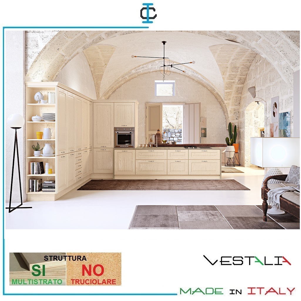 Cucina VESTALIA Pera6. Cucina con colonne angolo e penisola in stile Shabby . Cucina con ante in Legno Frassino tinta Mandorla e con struttura in legno multistrato. Cucina composta da : libreria, colonne dispensa, colonna frigo, colonna forno, penisola con cestoni, zona cottura e zona lavello, pensili. Stile Shabby. Misure (cm): L.245 x 425 P.60/120 H.216