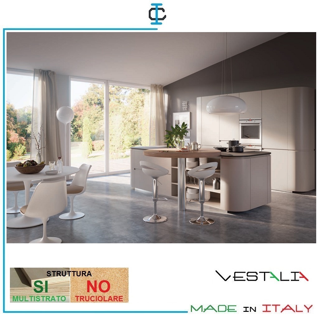 Cucina VESTALIA mod. Tonda3. Cucina in stile Contemporaneo con parete colonne ed isola. Cucina con ante in MDF laccato con tinte a scelta e struttura in legno multistrato. Cucina composta da : colonne terminali, colonna frigo, colonne dispensa, colonne forno, isola con zona lavello e zona cottura. Stile Contemporaneo. Misure (cm):