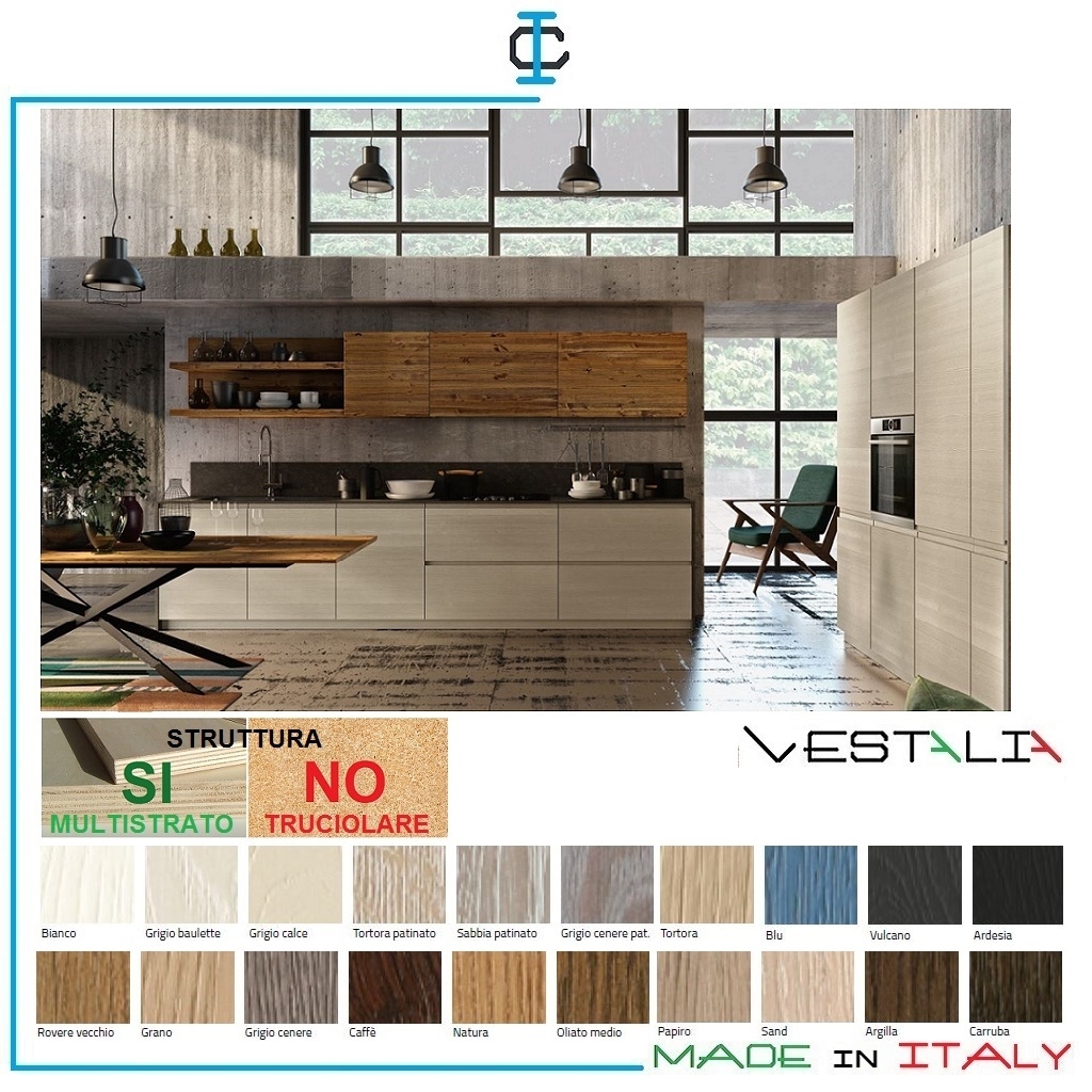 VESTALIA progetta e produce cucine in legno, componibili e su misura con materiali e finiture a scelta del cliente.