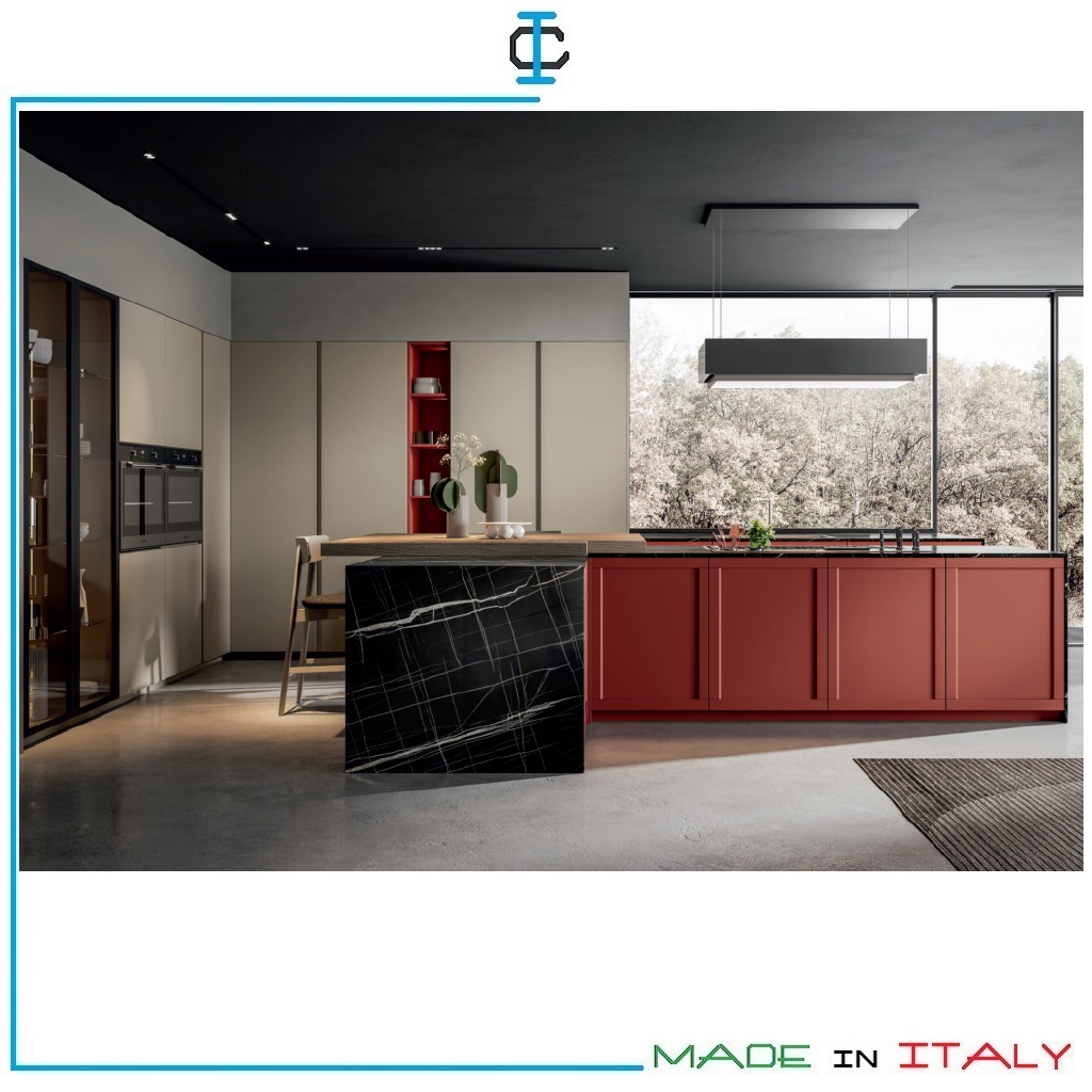 Cucina con telaio Rosso ed Isola. Cucina composta da : vetrina, colonne forno, colonne dispensa, libreria, colonna frigo, zona lavello, zona cottura, isola con zona cottura. Materiali strutturali a scelta e colori configurabili. Design Contemporaneo. Misure (cm): Parete L.335 x 456 H.216 Isola L. 125 x 330