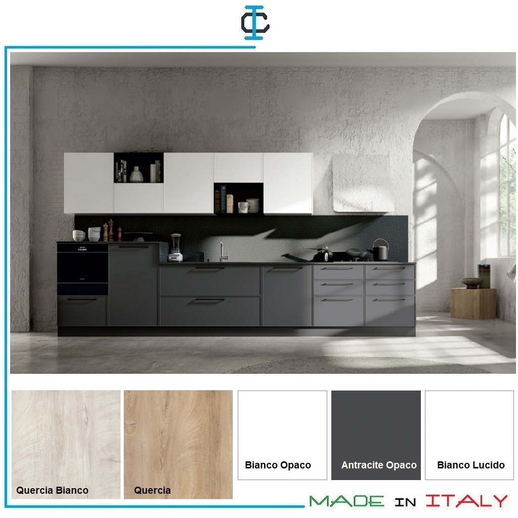 Cucina Antracite con telaio. Cucina con ante in MDF 22 mm. raggiati con telaio, rivestiti in polimerico tinta Antracite e Bianco opaco. Cucina composta da : colonna forno, colonna dispensa, zona lavello, zona cottura, pensili. Stile Nordico